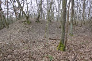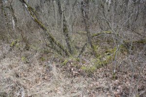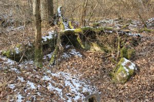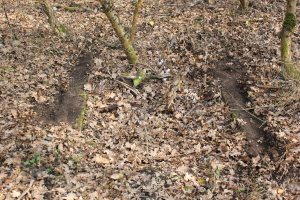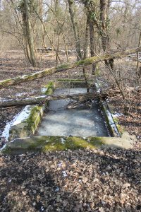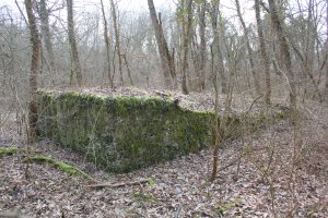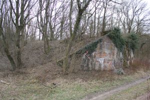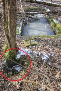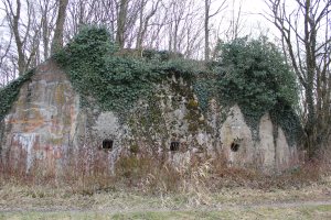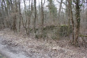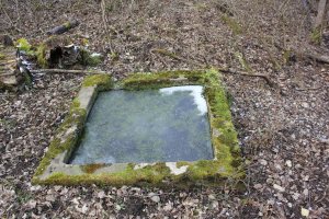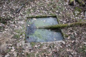 Punkt 6: gesprengter Unterstand, in der Nähe ein Wasserbecken (weitere Becken entlang des Waldweges)