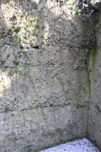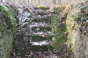 Von beiden Seiten führt eine Treppe in den Graben. Ein Eingang ist nicht zu erkennen (verschüttet).