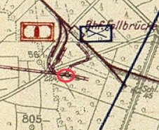 Interessantes Detail: Die Wände der beiden Häuser wurden in mehreren Etappen betoniert und sind mit Maschendraht armiert.Die beiden Häuser standen neben dem Bahngleis (roter Kreis).