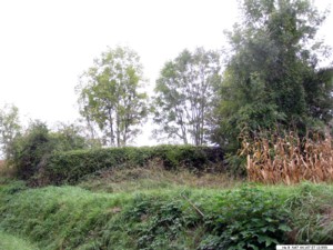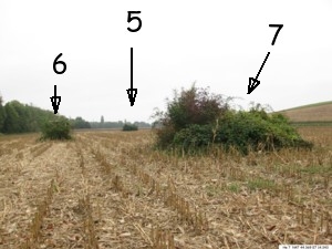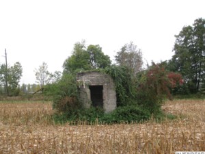 7 (N47 44.369 E7 14.343): In der Hecke ist ein Betonbau sichtbar. Die Feldbahn verlief rechts von den drei Bauten.