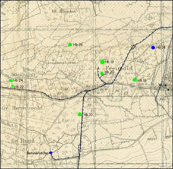 Hier ein alter Kartenausschnitt mit dem Verlauf der Feldbahn in diesem Abschnitt. Zur besseren Orientierung sind einige Bauwerke eingezeichnet: