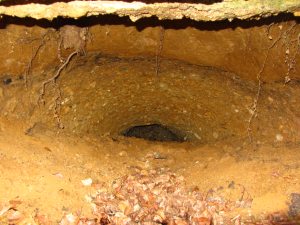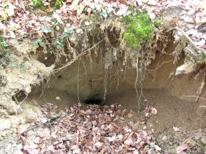 H 150: Mulde von Wellblech-Unterstand, Wellblechreste noch sichtbar.
