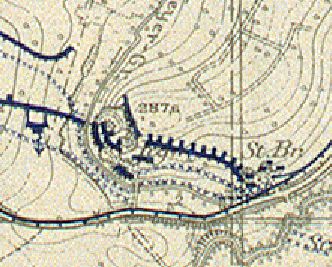 Der Trentlingergraben ist auf der Stellungskarte (rechts) mit "Weyergraben" bezeichnet. Das kleine Wäldchen hat in Ost-West Richtung nur einen Höhenunterschied von rund 30 Meter, fällt aber nach Westen steil ab. Dort oben über dem Steilhang bei den Punkten 13-15 befand sich eine Artilleriestellung. Ein weiteres Geschütz stand bei Punkt 18 in dessen Umgebung noch etliche Einschlagtrichter zu sehen sind.