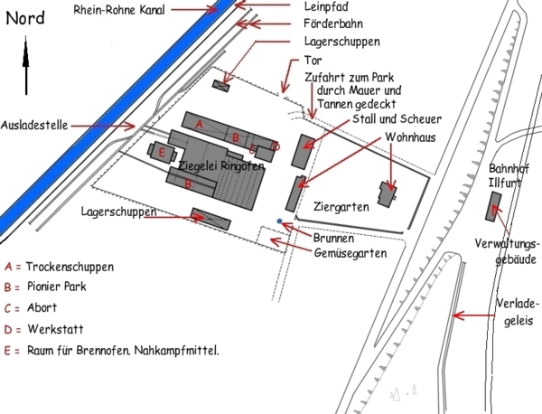 Wie wir schon gesehen haben, wurde der Pionier-Park Illfurt am 4.11.1915 eröffnet. Durch eine Lageskizze der Württ. Landst. Pionier Park Komp. Nr. 16/XIII., datiert vom 6.11.1915, erfahren wir, dass die Pioniere in der Ziegelei Schmerber & Cie schon zwei Räume belegt, oder sollte man besser sagen "requiriert" hatten.