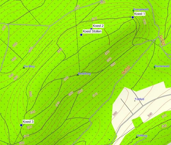 Koest-Stollen: Hier befand sich eine große Stollenanlage von der noch etliche Eingänge vorhanden sind. Die Anlage erstreckt sich über eine Länge von ca. 100 Meter.