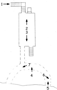 Die Zahlen geben die Bildnummer an, die Pfeile die Blickrichtung. Auf dem Bild die jeweilige Nummer und Bezeichnung. Auf Bild 3 ist neben der Treppe der Abgang in den Stollen zu erkennen, der jedoch im unteren Teil verschüttet ist.