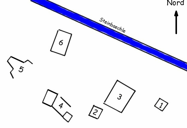 Blick von Nr. 6 auf die Bauten 1, 2, und 3: