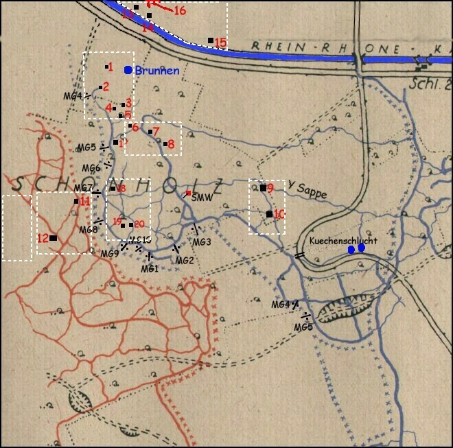 Bei Problemen mit der Wiedergabe der interaktiven Karte sind folgende Beiträge verlinkt (von oben nach unten und links nach rechts): Nördlich vom Kanal, Gebiet um die "Villa Schwabenstolz", Gebiet 6, 7 und 8, "Knochenberg", Gebiet 11 und 12, Gebiet 18, 19 und 20 und Gefechtsstand und Sanitätsunterstand (Gebiet 9 und 10).