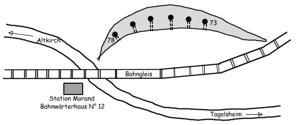 Abschnitt 2: Planskizze, kleiner Einschnitt zwischen Tagolsheim und Walheim westlich der Bahnlinie. Unterstände 10 - 13: