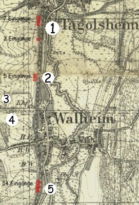 Die Stollenanlagen an der Bahnlinie bei Tagolsheim und Walheim. Karte von Juni 1916. Bauabschnitte 1 bis 5: