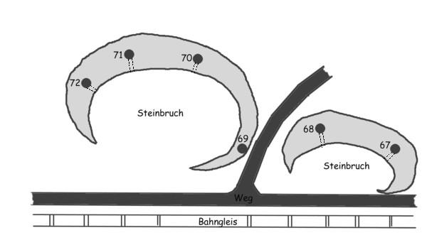Abschnitt 8: In den zwei alten Steinbrüchen zwischen Km 15,1 und 15,2 die Unterstände N° 67 bis 72. Sechs Unterstände für je 16 Mann = 96 Mann: