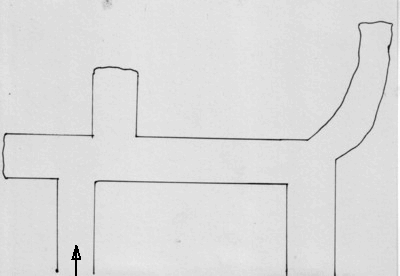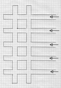 Beispiel-Skizze einer Stollenanlage mit fünf Eingängen und zwei Querstollen (Gallerie):