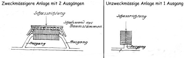 Bei Stollenanlagen hat es sich bewährt, die ersten Rahmen der Stolleneingänge in der Schussrichtung kräftig zu verstreben und mit Schürmanneisen gegenseitig zu verbinden. Die Stollenrahmen in den Eingängen dürfen nicht vertikal, sondern senkrecht zur Schachtneigung gesetzt werden (Schleppschächte). Durch die Verzapfung der Rahmenhölzer werden die Deckenhölzer so geschwächt, dass dieselben durch Artillerie- oder Minentreffer geknickt werden, auch wird bei älteren Stollenanlagen die Tragfähigkeit der Deckenhölzer durch die Wirkung der Feuchtigkeit bedeutend herabgesetzt: es empfiehlt sich deshalb eine Verstärkung durch besondere Unterzüge.