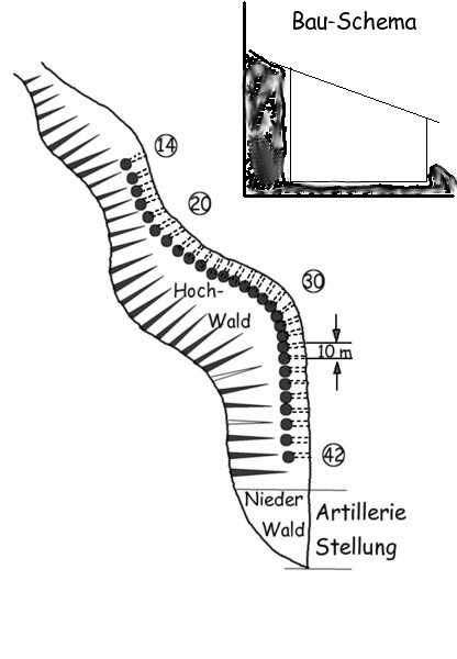 Auf der Skizze die Bauarbeiten vom Januar 1916. Zu den bereits vorhandenen kamen weitere 15 Unterstände mit einer Kapazität von jeweils 32 Mann. D.h. für 15 x 32 = 480 Mann.