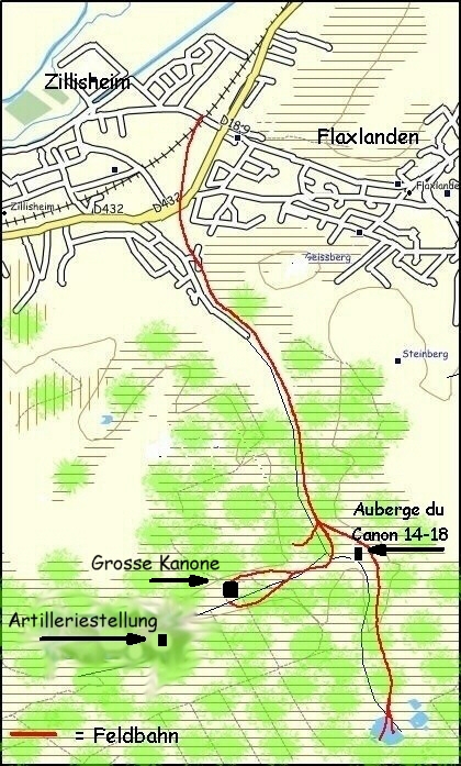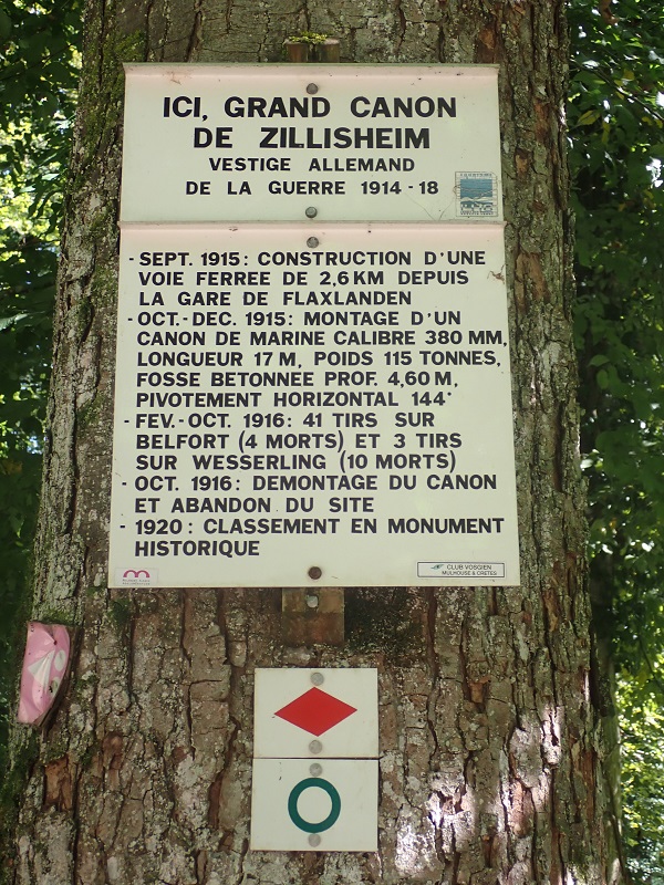 Die große Kanone von Zillisheim war der "Lange Max", eine 38cm-Schnellladekanone L/45. Das Geschütz war aufgrund seiner Größe und Wirkung sehr populär und zählte zu den größten damals eingesetzten Kalibern. Es wurde sowohl als Eisenbahn- als auch, wie hier, als Bettungsgeschütz eingesetzt und hatte ein Reichweite von bis zu 48 km. Für den Transport von Material und Munition wurde eigens eine 2,6 km lange Bahn installiert. Die Arbeiten begannen im September 1915, und schon am 8. Februar 1916 wurde der erste Schuss nach Belfort gefeuert. Insgesamt wurden mit dieser Marinekanone der Firma Krupp 44 Schuss abgegeben, 41 nach Belfort und 3 nach Wesserling.