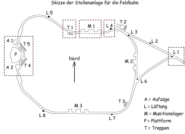 Rund 200 Meter vor der Plattform, der sogenannten Kesselbettung, verläuft die Feldbahn mit Spurweite 60 cm in einem Stollensystem von rund 500 Meter Länge. Der Stollen war, ausser durch den Eingang, noch über 5 Treppenanlagen zugänglich. Im Stollen befinden sich 3 Munitionslager mit je 3 Kammern. Über 2 Aufzüge konnte die Munition (Gewicht 750 kg) nach oben zum Geschütz gebracht werden.