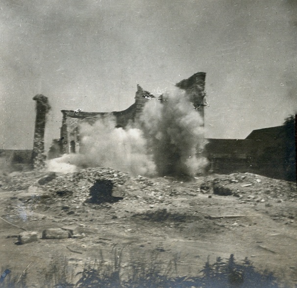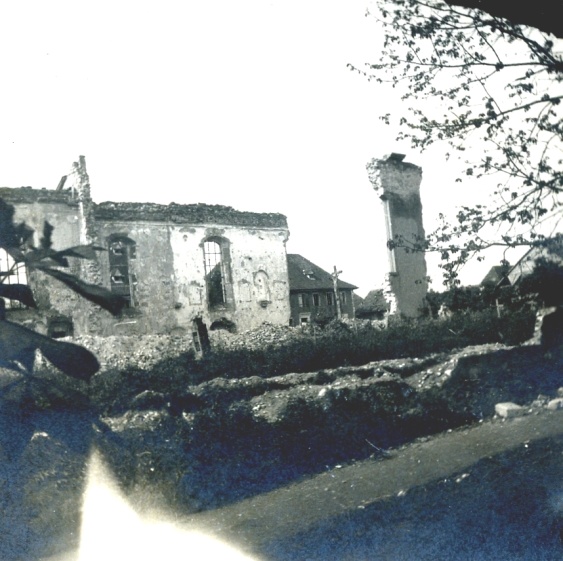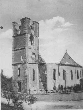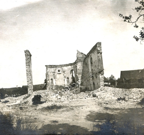 Das Dorf und die Kirche wurden während des Ersten Weltkriegs vollständig zerstört, die Reste gesprengt. Das Schicksal der Kirche dokumentieren einige Bilder: